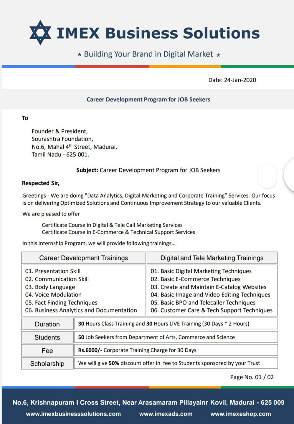 ஸௌராஷ்டிரா பவுண்டேசன் தன்னார்வ தொண்டு நிறுவனம் மற்றும் IMEX பிசினஸ் சொல்யூஷன்ஸ் ஆகியவை சந்தை தேவை வேலை வாய்ப்புகளின் அடிப்படையில் குறுகிய கால தொழில் மேம்பாட்டு பயிற்சி வகுப்பை வடிவமைத்து உள்ளது.