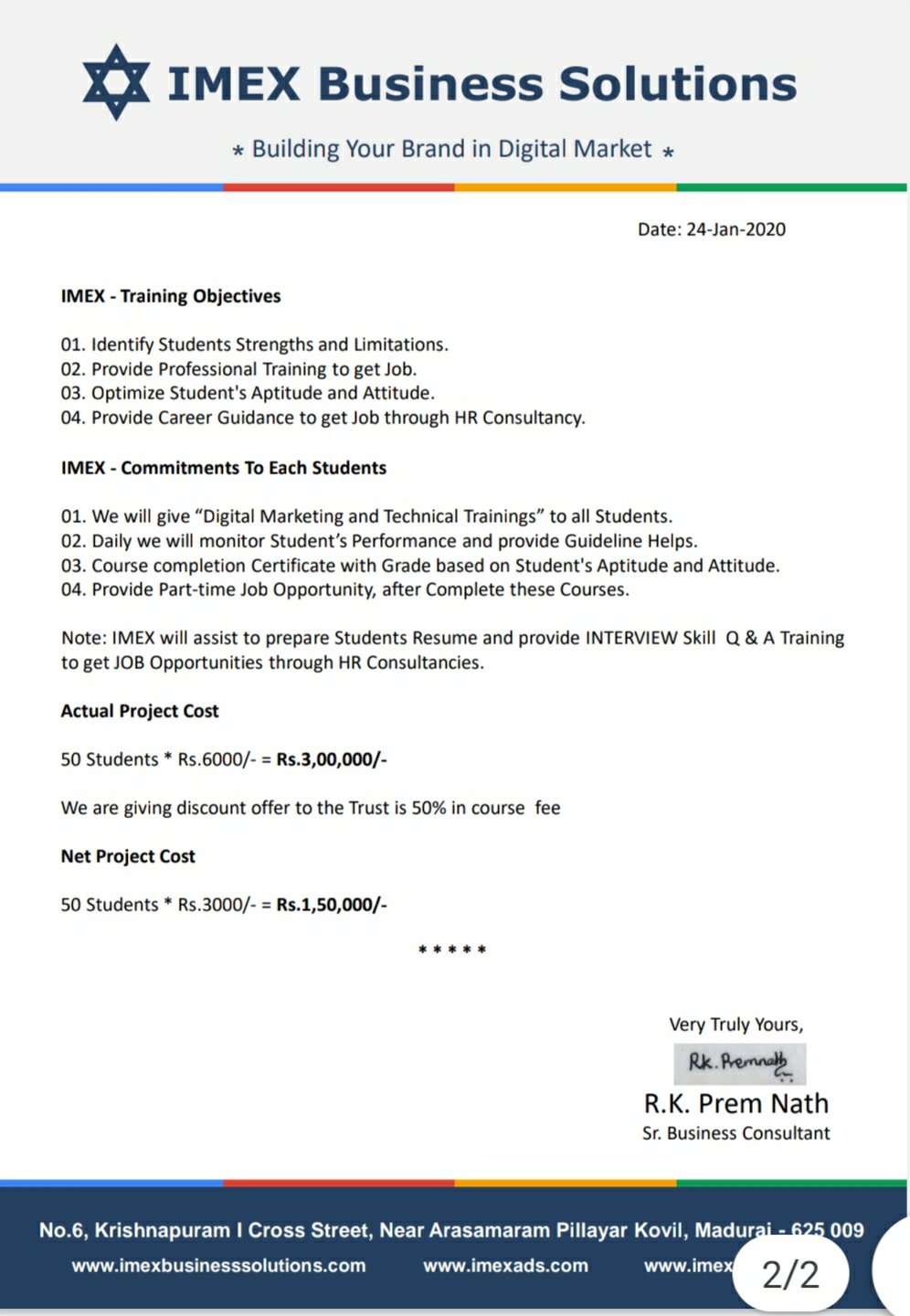 50 கல்லூரி இறுதி ஆண்டு படிக்கும் மாணவ/மாணவிகள் மற்றும் படித்து முடித்து வேலை தேடுபவர்களுக்கு சலுகைக் கட்டணத்துடன் 30 நாள் பயிற்சி அளிக்க திட்டமிட்டுள்ளோம், அதாவது ரூ.3000 / –