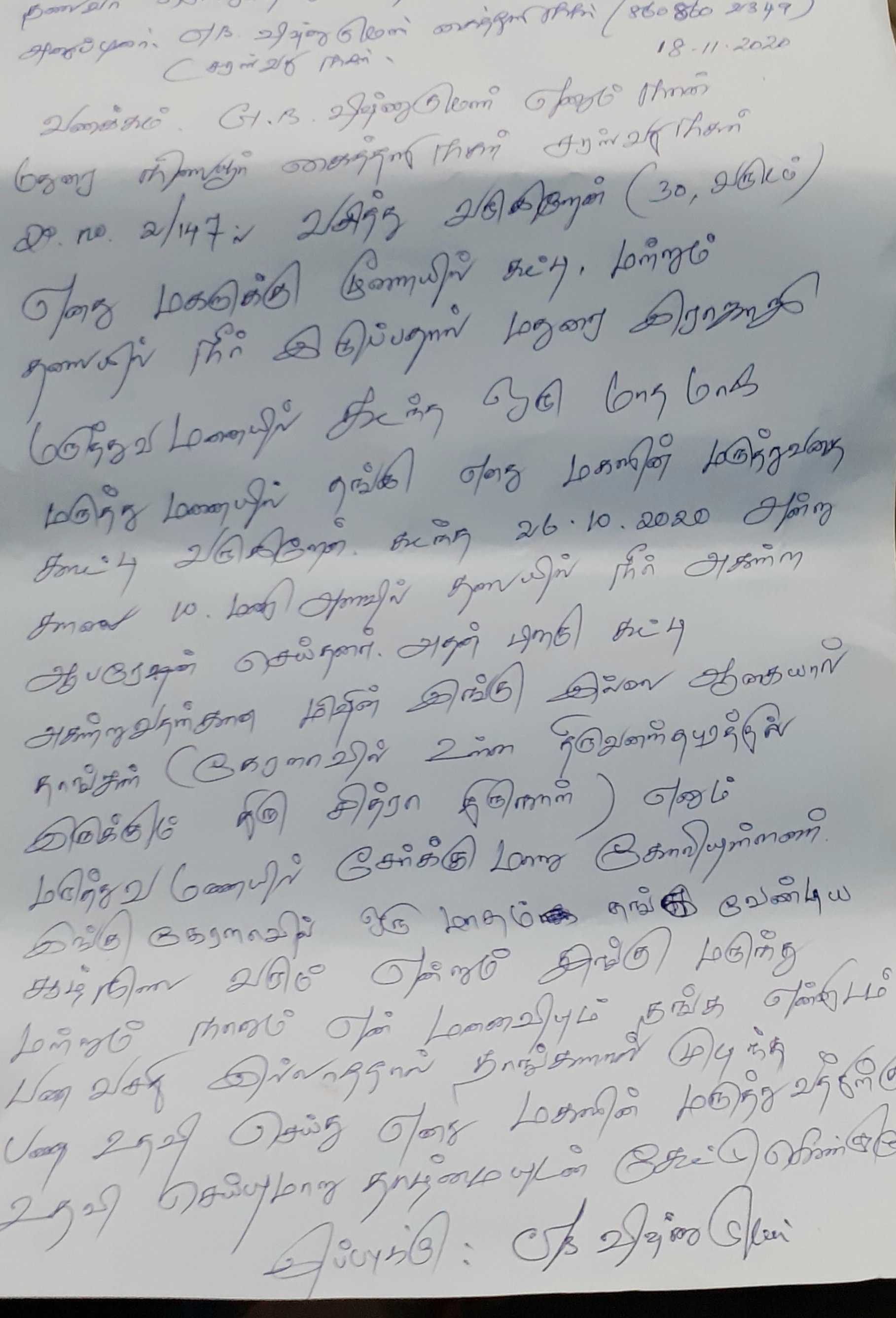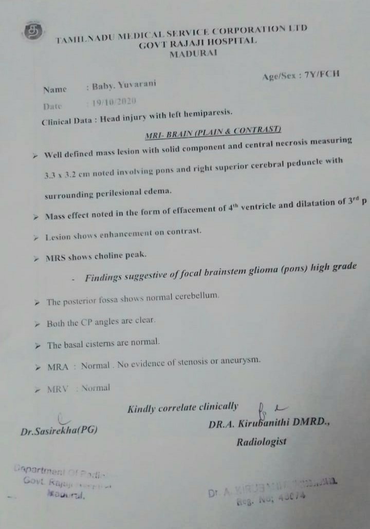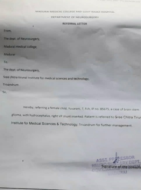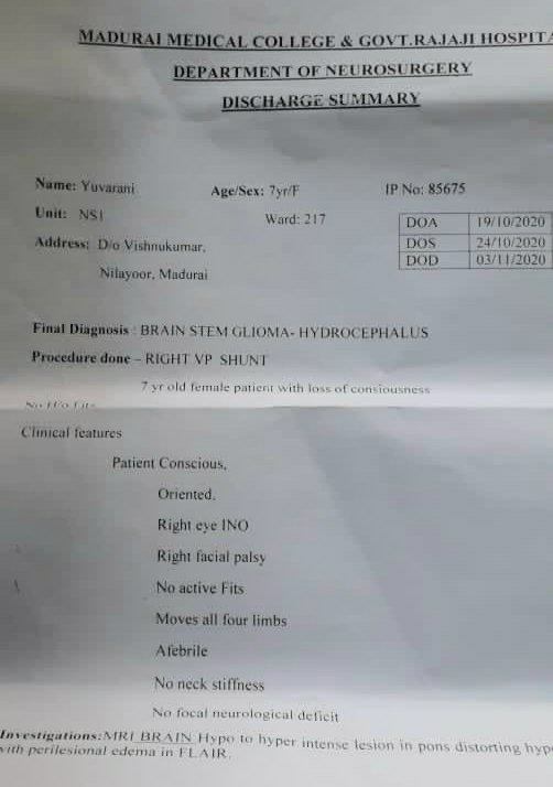 (அலைபேசி எண் 8608602349) மகள் ஏழு வயதுள்ள G.V.ஸ்ரீ யுவராணி மூளையில் கட்டி மற்றும் தலையில் நீர் இருப்பதால் மதுரை ராஜாஜி மருத்துவமனையில் ஆபரேஷன் செய்யப்பட்டு மேல்சிகிச்சைக்காக திருவனந்தபுரத்தில் உள்ள சித்ரா மருத்துவமனையில் இலவச மருத்துவம் பார்க்க சேர உள்ளார்கள். அங்கு சென்று மருத்துவம் பார்க்க போக்குவரத்து செலவு, உணவு, தங்கும் செலவு, மருந்து செலவு ஆகியவற்றிற்கு உதவி தேவைப்படுகிறது.