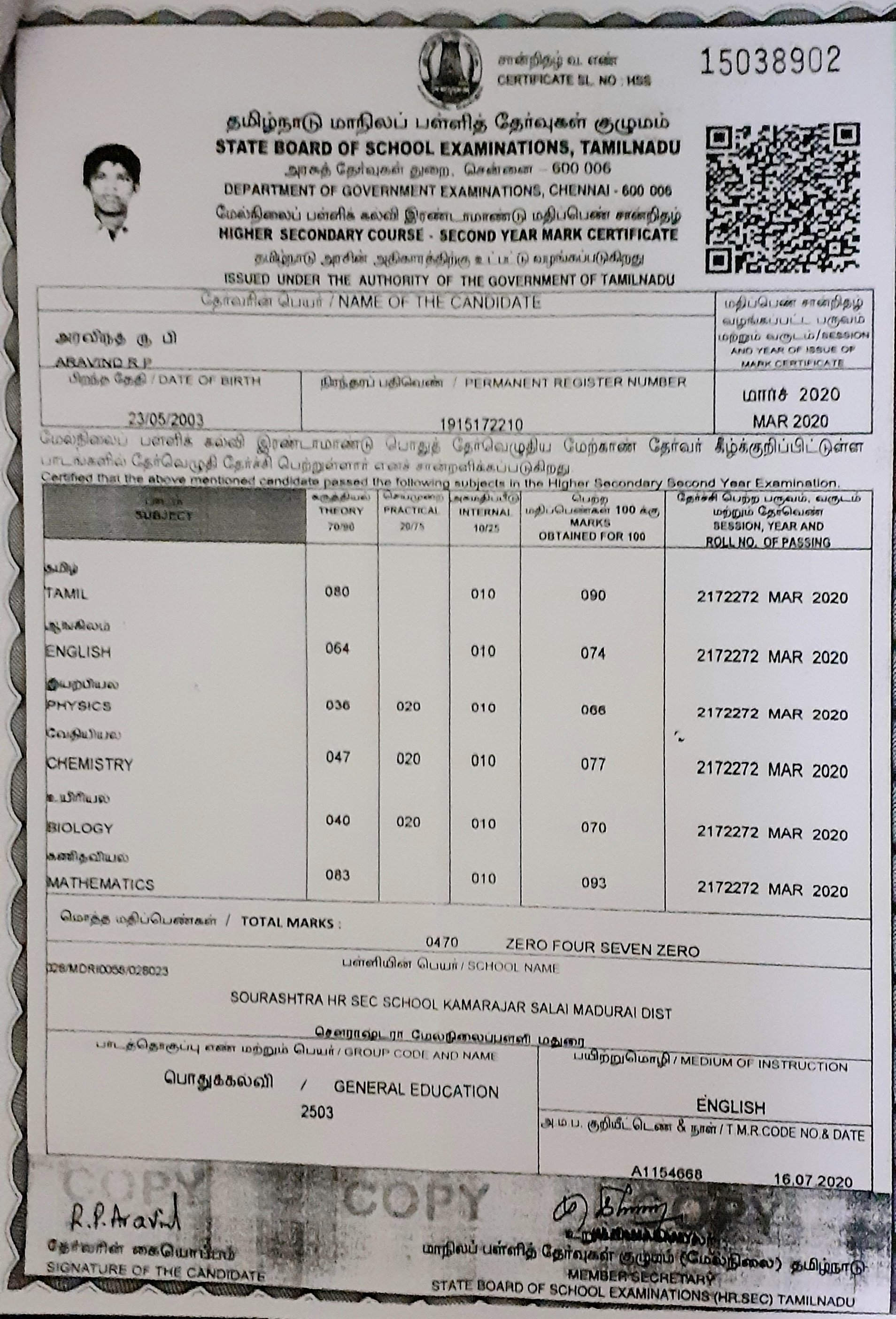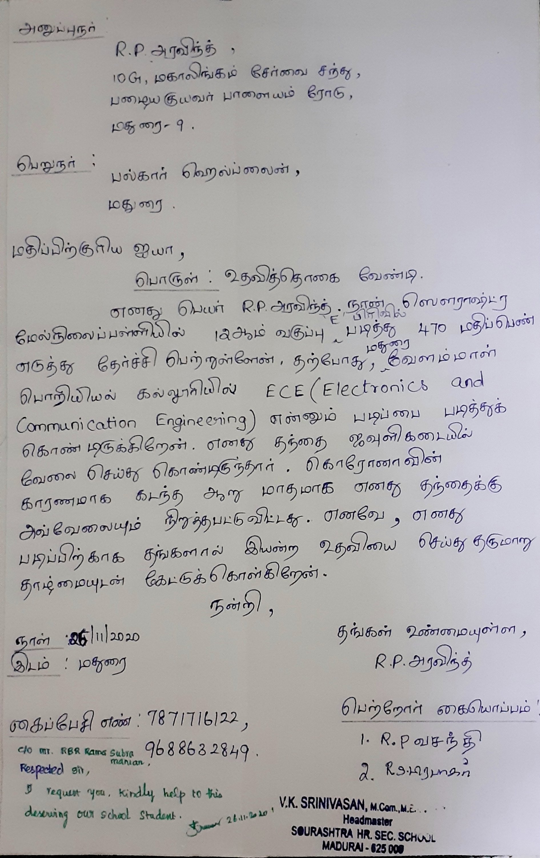 நமது சமூகத்தை சார்ந்த மாணவன் திரு.R.P.அரவிந்த் +2 வில் 470 மதிப்பெண் பெற்று அரசாங்க ஒதுக்கீட்டில் மதுரை வேலம்மாள் பொறியியல் கல்லூரியில் B.E ECE சேர்ந்து உள்ளார். வருட கல்வி கட்டணம் Rs.74,200/-. ஏழ்மை நிலையில் உள்ளதால் உதவி கோருகிறார். தங்கள் நன்கொடைகளை கீழ்கண்ட வங்கி கணக்கிற்கு அனுப்புமாறு கேட்டு கொள்கிறோம்.